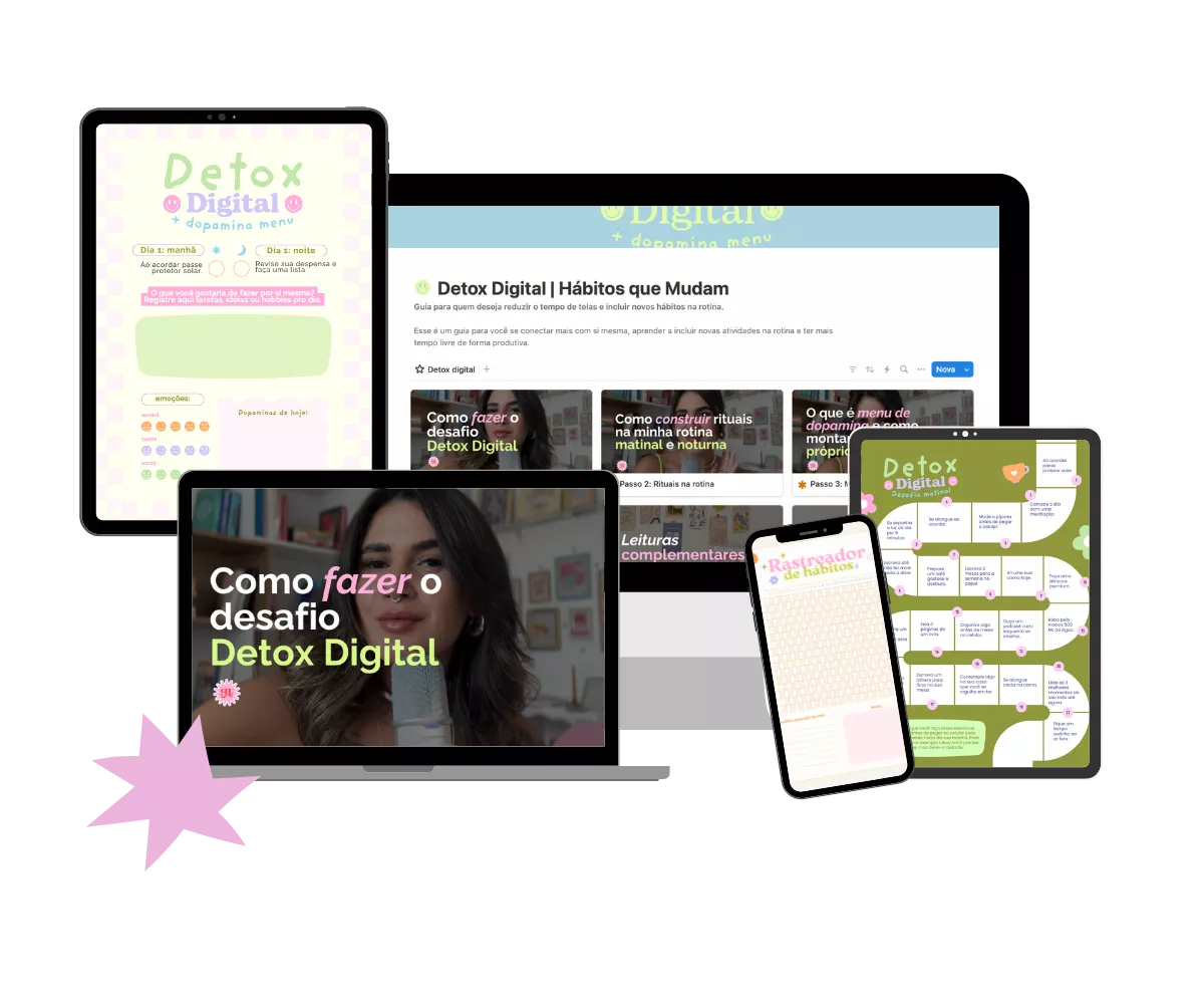 Para aprender como fazer o desafio, criar seus próprios rituais, reduzir o tempo de telas e usar o menu de dopamina criamos um Notion com aulas e acesso aos materiais de apoio.