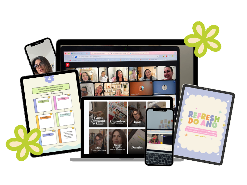 Encontros especiais com temas profundos como planejamento, reset de hábitos, organização, inteligência emocional e mais. Um mergulho guiado em você mesma.