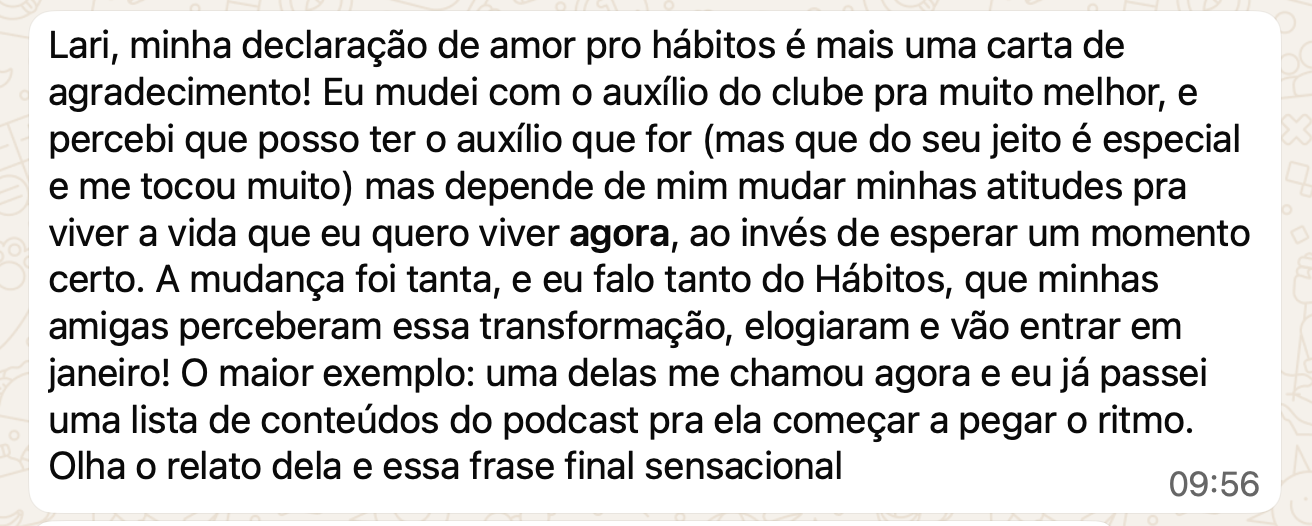 Assinando qualquer opção do Club anual você garante todos esses materiais, exceto a mentoria mensal de 1h com a Lari fundadora do Hábitos que Mudam.