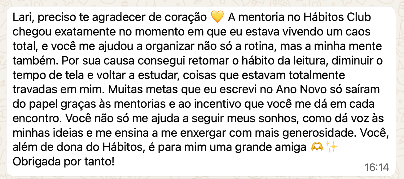Sou a fundadora do Hábitos que Mudam, uma comunidade que criei em 2018, depois de anos trabalhando com planejamento estratégico em agências de Publicidade. Desde então, venho ajudando milhares de mulheres a organizarem seus dias, cultivarem novos hábitos e viverem com mais presença, mesmo com uma rotina agitada.